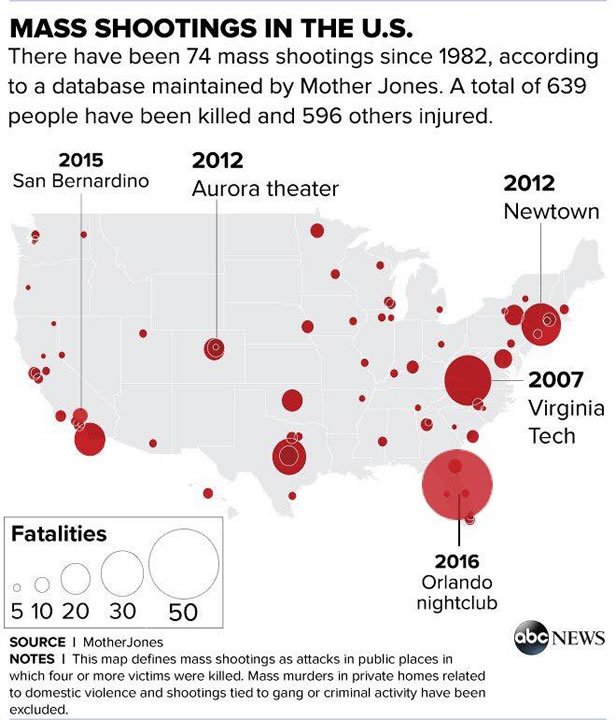 Ini adalah serangan mass shotter terburuk yang terjadi di Amerika, bahkan beberapa sumber mengatakan ini adalah peristiwa berdarah terburuk setelah Peristiwa 9/11 New York. Ilustrasi perbandingan peristiwa berdarah di USA: